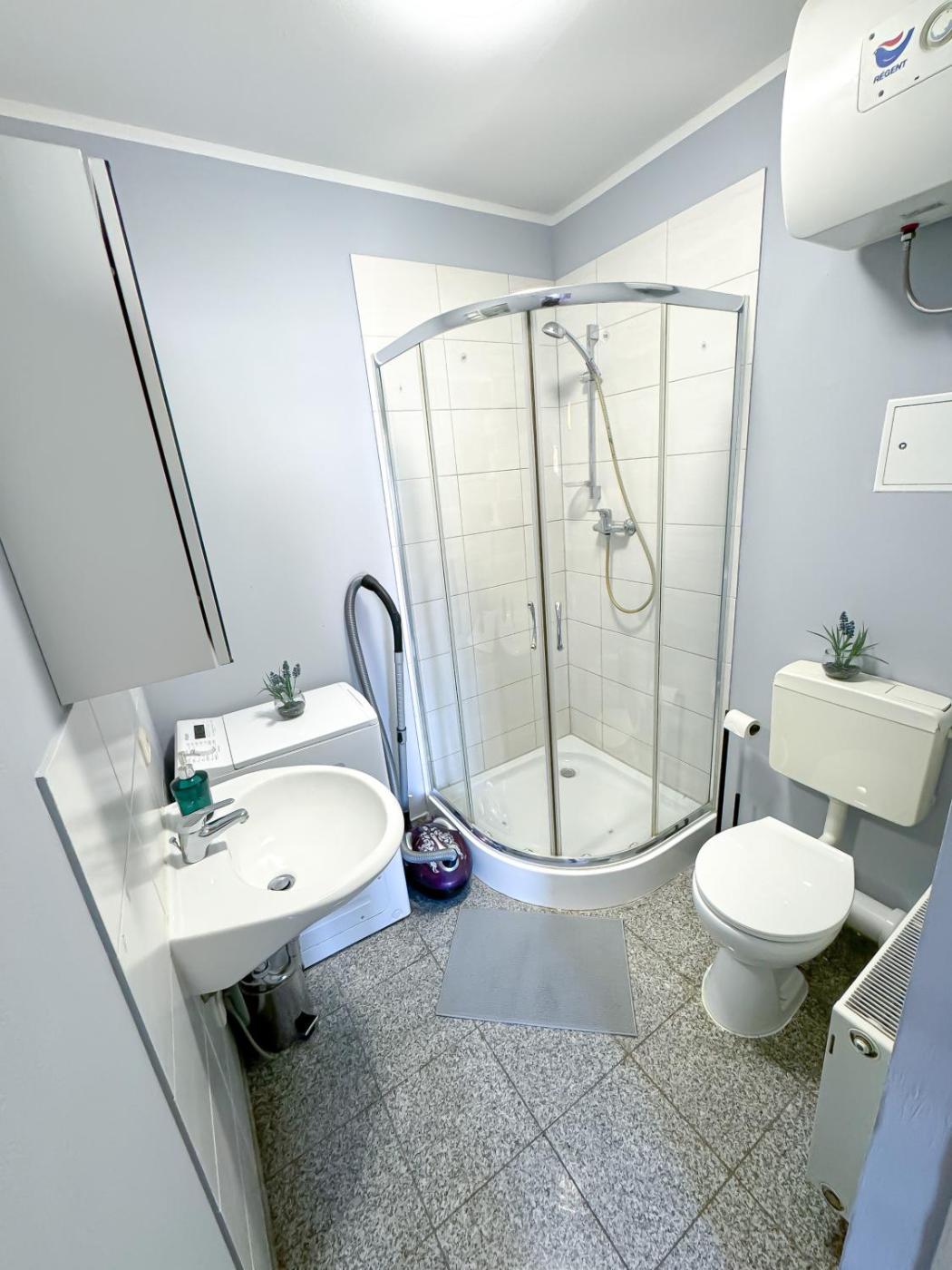 Quadruple Room with Private Bathroom. The spacious quadruple room provides a washing machine and a coffee machine, as well as a private bathroom featuring a shower. Meals can be prepared in the kitchenette, which comes with a stovetop, a refrigerator, kitchenware and a microwave. The quadruple room is fitted with a flat-screen TV, a dining area, a wardrobe, as well as heating. The unit offers 3 beds. ;