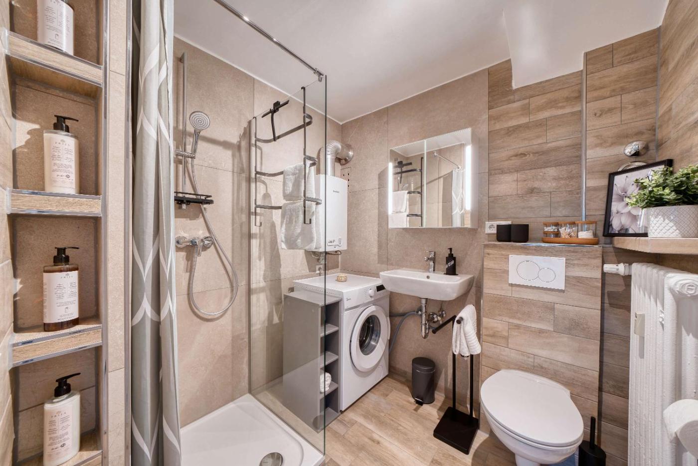 Two-Bedroom Apartment. This spacious apartment comprises 1 living room, 2 separate bedrooms and 1 bathroom with a shower and free toiletries. In the well-equipped kitchen, guests will find a stovetop, a refrigerator, a dishwasher and kitchenware. This apartment features a washing machine, a private entrance, flat-screen TV with streaming services, as well as winechampagne for guests. The unit offers 4 beds.